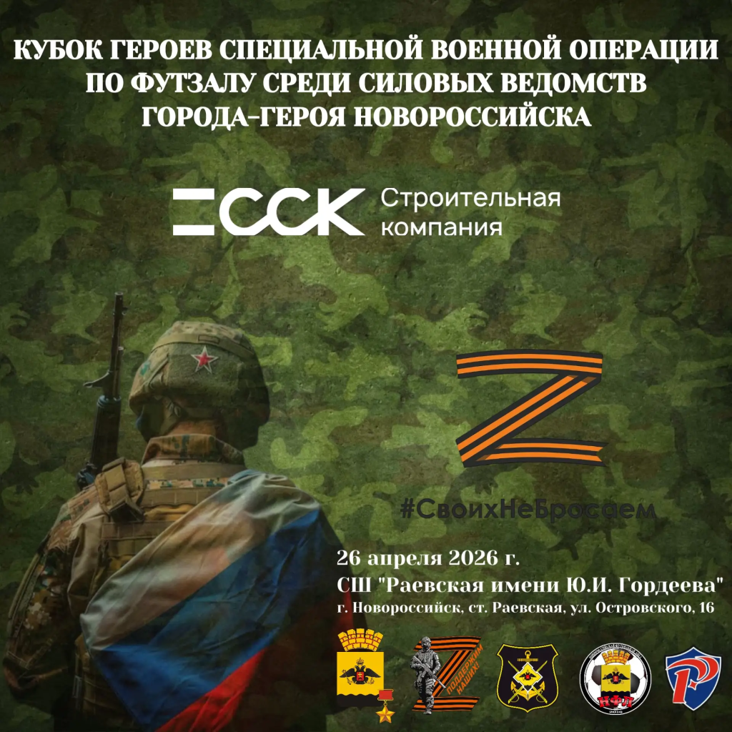 26 апреля на базе Спортивной школы «Раевская» имени Ю.И. Гордеева (станица Раевская, ул. Островского, 16) пройдет турнир по футзалу «Кубок Героев специальной военной операции среди силовых ведомств города-героя Новороссийска».