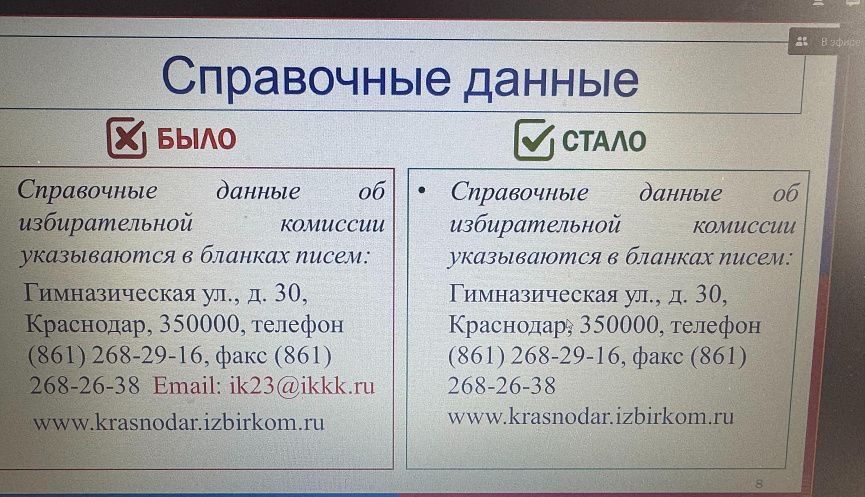Были рассмотрены вопросы об изменениях в Инструкции по делопроизводству в избирательной комиссии Краснодарского края и обзор позиций Верховного Суда Российской Федерации по административным делам о защите избирательных прав.