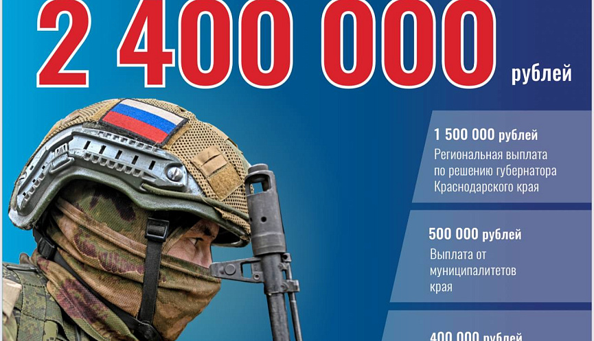 - В Краснодарском крае единовременная выплата при заключении контракта составляет 2,4 млн рублей