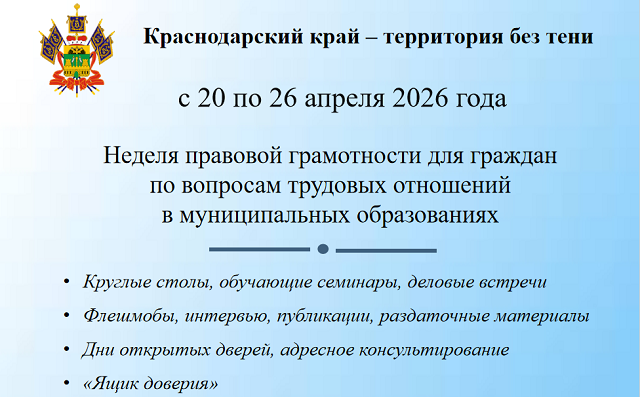Филиал ГКУ КК ЦЗН Краснодарского края в г. Новороссийске приглашает жителей города принять участие в Неделе правовой грамотности по вопросам трудовых отношений «Краснодарский край – территория без тени», которая пройдет с 20 по 26 апреля 2026 года.