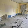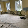 В учебных кабинетах выполнен демонтаж старого напольного покрытия и штукатурки, выполнены частичная заливка полов, покраска стен и замена системы отопления. Впереди – электромонтажные работы, установка потолочных покрытий и укладка ламината. Сейчас здесь ведутся демонтаж старого цоколя, заливка новой отмостки и оштукатуривание цокольного этажа.