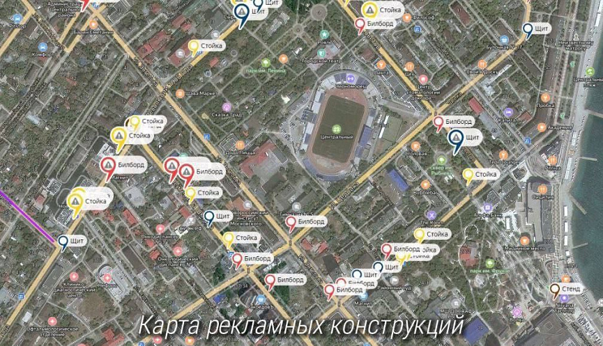 Отделом эстетики городской среды и наружной рекламы сформирована карта, где отмечены фактически установленные рекламные конструкций по районам.