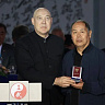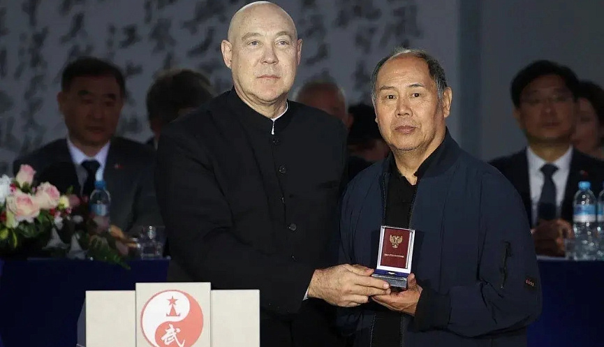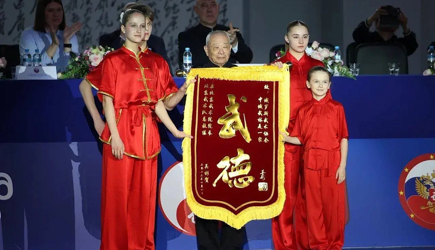 Легендарный создатель современного спортивного ушу У Бинь – мастер боевых искусств, тренер, воспитавший больше чемпионов, чем любой другой наставник в Китае, обладатель 9 дуань ушу, наставник таких звёзд, как Джет Ли (Ли Ляньцзе) и У Цзин, – вручил сборной России знамя с надписью «Воинская доблесть»!
