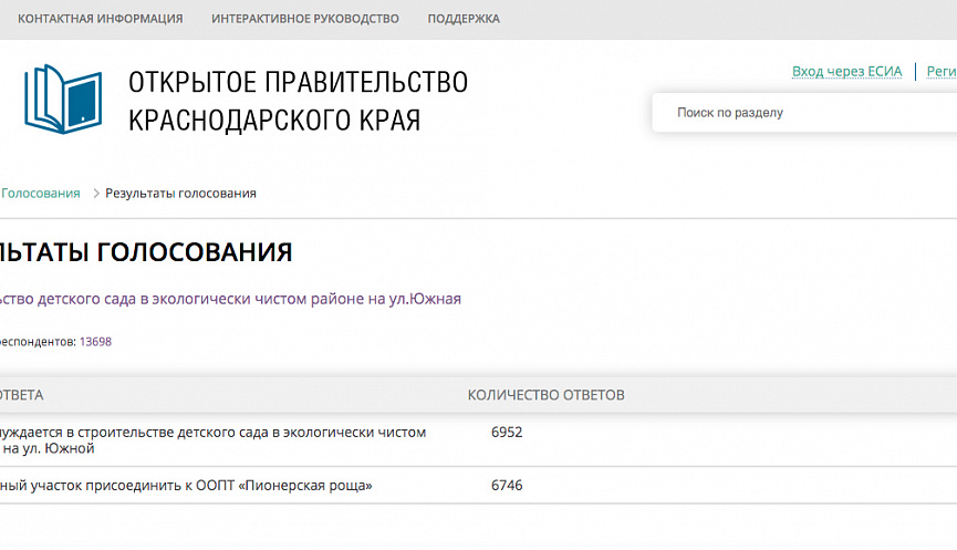 На сайте Открытого правительства Краснодарского края завершилось голосование по вопросу строительства детского сада рядом с ООПТ «Пионерская роща». Оно проводилось с 19 по 23 апреля и собрало мнения 13698 респондентов.