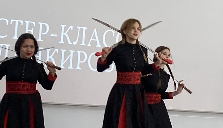 Занятие провели в Новороссийском колледже строительства и экономики молодые солистки ансамбля сценической фланкировки «Дуся да Маруся» из Центра казачьей культуры Новороссийского районного казачьего общества.