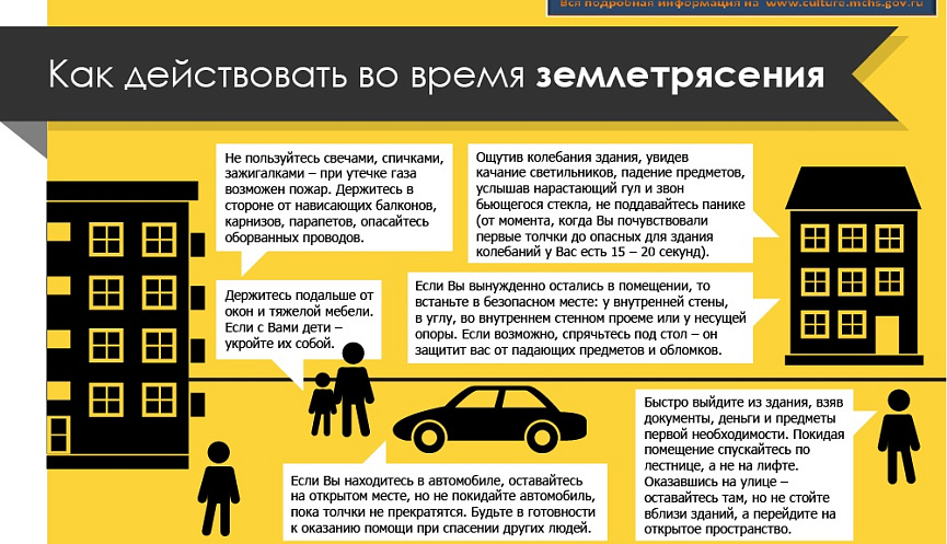 Ощутив колебания здания, увидев качание светильников, падение предметов, услышав нарастающий гул и звон бьющегося стекла, не поддавайтесь панике (от момента, когда Вы почувствовали первые толчки до опасных для здания колебаний у Вас есть 15 – 20 секунд). Быстро выйдите из здания, взяв документы, деньги и предметы первой необходимости. Покидая помещение спускайтесь по лестнице, а не на лифте. Оказавшись на улице – оставайтесь там, но не стойте вблизи зданий, а перейдите на открытое пространство.