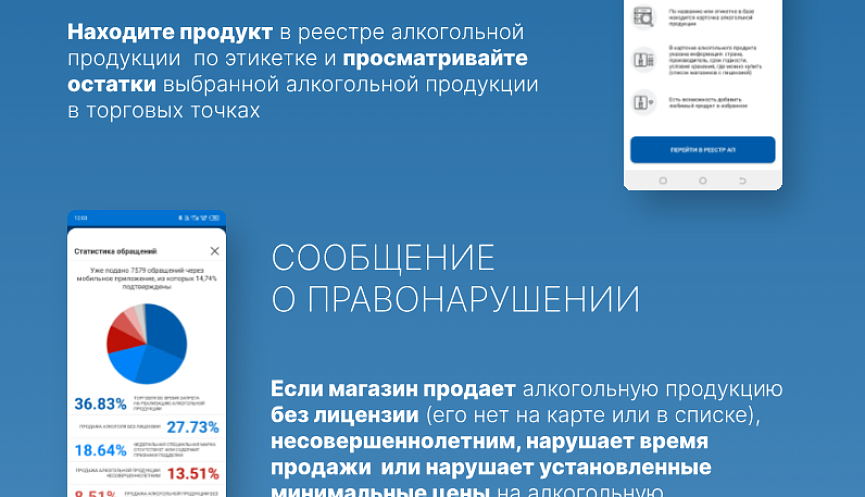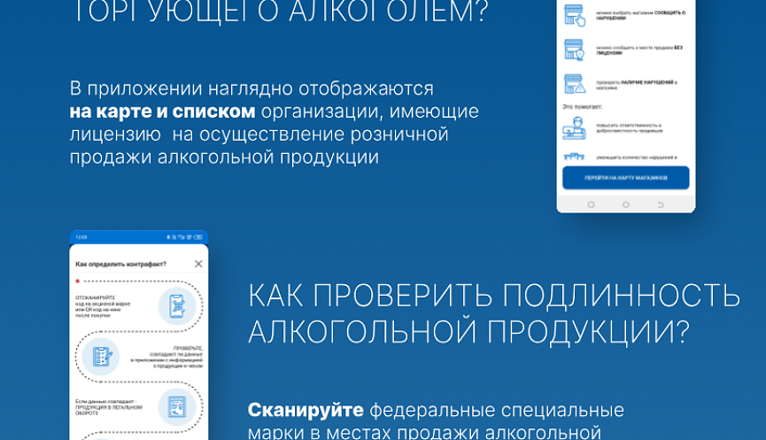 С помощью мобильного приложения «АнтиконтрафактАлко» (изучите карточки к статье) пользователи отсканировав федеральную специальную марку имеют возможность проверить подлинность алкогольной продукции, убедиться в наличии лицензии, найти ближайшие легальные пункты продаж алкоголя.