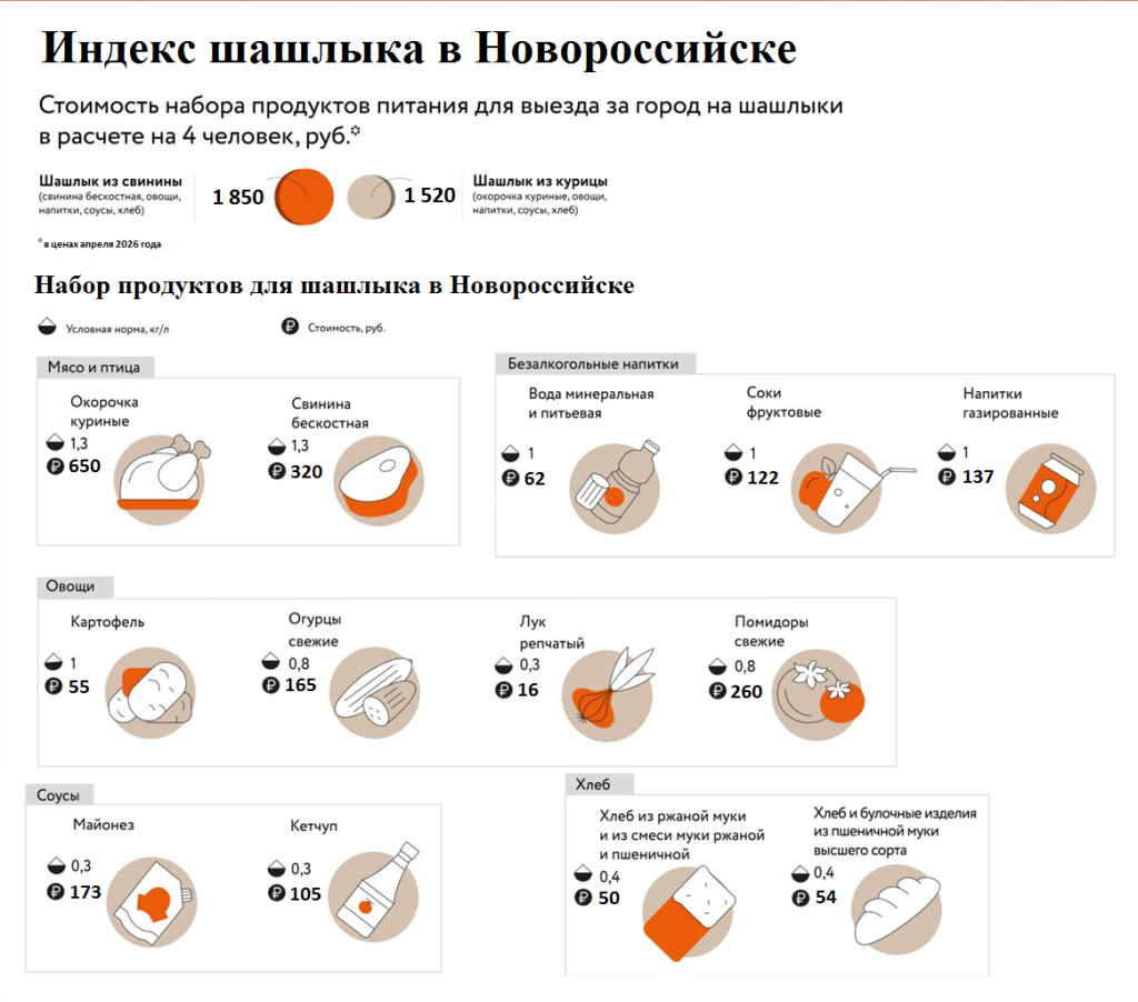 Расчет средней стоимости классического рецепта шашлыка на компанию из 4 человек представлен в карточке.